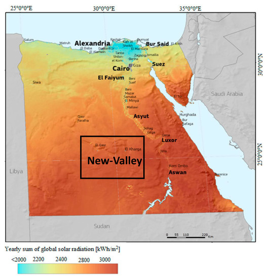 The New Valley region in the western desert of Upper Egypt is one of the promising regions on which development strategies are based according to Egypt’s Vision 2030. This region is well-known for its richness in various types of mineral wealth, soil fertility and the availability of groundwater. The recently published solar atlas of Egypt indicates that this region has another treasure. Figure 2 illustrates the yearly sum of global solar radiation over New Valley as compared to other Egyptian regions. The average yearly solar radiation over New Valley ranges between 2800 and 3200 kWh/m2 according to the average values during the last 20 years. The daily duration of sunshine fluctuates between 9 and 11 h [29]. This climate gives New Valley the priority for investment in renewable energy projects.
