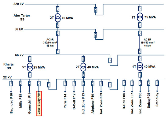 Two far demand areas (Arbien and Max) located in the New Valley region were selected as a case study. The two areas are electrically fed by the same DN. Figure 3 illustrates the location of this Upper Egypt distribution network (UEDN) compared to the path of the Egyptian unified electrical grid. The single-line diagram of the existing network that supplies these areas with electrical energy is shown in Figure 4. The selected areas are supplied from the Kharja substation through the transformer 5T of capacity 25 MVA with a transformation ratio of 66/22 kV. The Kharja substation is connected to the extra-high-voltage grid through the Abo Tartor substation 220/66 kV by two circuits. Each circuit is constructed by an overhead line of aluminum conductors steel reinforced (ACSR) with a cross-sectional area of 380/50 mm2 and 48 km in length. A detailed description of the studied network and its load distribution is given in Section 5.2.