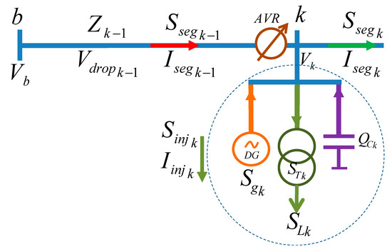 - Update the matrix according to the voltage drop formerly determined in the backward sweep. Considering the voltage at any arbitrary node k ( shown in Figure 5) is the voltage at its predecessor node b () minus the voltage drop across the segment connecting them ().