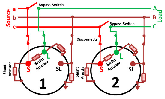 Since the common configuration of a primary DN is delta, single-phase AVR units are typically grouped in one of two connections [16]: closed-delta or open-delta. Figure 7 shows the closed-delta connection where three single-phase units are required to provide up to 15% voltage regulation. In an open-delta connection, only two units can be used to provide up to 10% voltage regulation as illustrated in Figure 8.