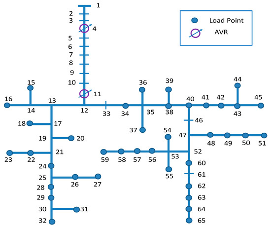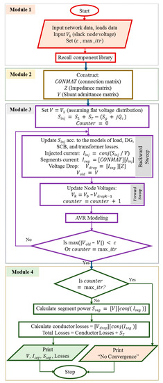 Recently, distribution utilities have faced new challenges concerning environmental conservation, power sustainability and energy market economics. Therefore, a remarkable growth in the penetration rate of distributed generation (DG) units inside power DNs has been informed [20]. This growth turns the classical passive distribution networks (PDNs) into active distribution networks (ADNs) concerning the bidirectional flow of power [21,22,23]. A popular definition of the ADN was presented in [24] by the CIGRE working group C6.19. The new topology of ADNs necessitates modern simulation of network impedances under different grid conditions [25,26]. The newly added components lead to the need of modeling balanced and/or unbalanced ADNs using grid-connected inverters [27]. Reference [28] presents a review of power distribution planning models in ADNs where a lack of modeling networks containing an automatic voltage regulator (AVR) as a voltage control unit is noticed. Moreover, the previously presented models neglect one important source of losses in real DNs, namely power dissipated inside distribution transformers. This paper tries to fill this gap and presents a comprehensive power-flow program based on the BFS technique. The program is embedded with models of the commonly used DN components.