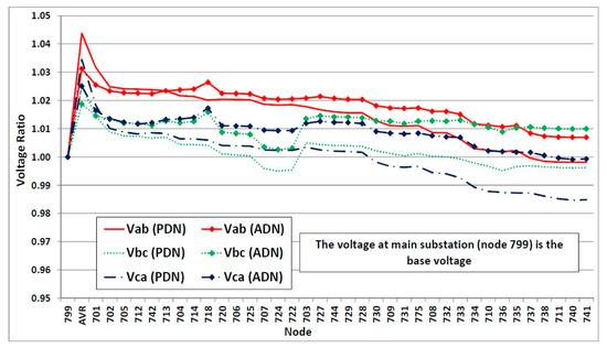 To convert this test system to an ADN, the network was divided into three zones. Each zone has a local area control center (LACC) to monitor and control the corresponding area. Each zone is supposed to have a constant power factor DG unit of type-III. The three DG units were assumed to have the same rated active power of 500 kW at 0.958 power factor for each. The DG units were located at nodes 720, 744 and 734. Figure 10 compares the line-to-line voltage profile along with the PDN nodes to that along with the ADN nodes. As shown, the conversion to ADN improves voltage unbalance. The shape of the voltage profile also appears to become more flattened in the case of the ADN.