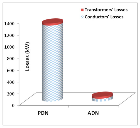 Table 2 confirms the same results and clarifies how the conversion to ADN preserves the AVR. As concluded from Table 3, the conversion to ADN greatly reduces the overall network loss to become less than 30% of its previous PDN value.