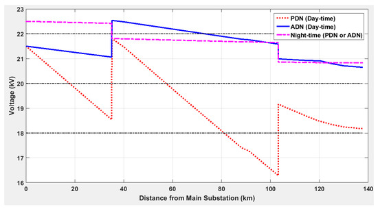 Voltage behavior of the ADN as compared to the passive distribution network (PDN) in case I.