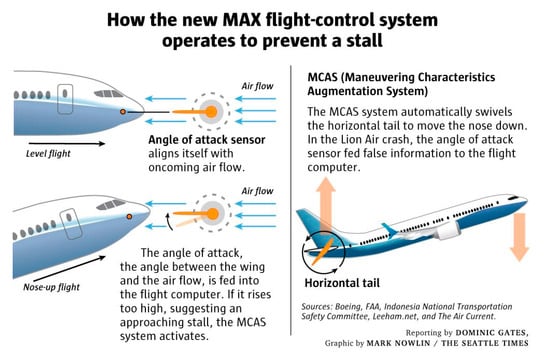 In October 2018, 189 passengers perished when Lion Air Flight 610 crashed a few minutes after taking off from Jakarta. Boeing implied that the crash was due to human error and embarked on a process meant to update the online training software administered to pilots. A few months later, in March 2019, Ethiopian Airlines Flight 302, a second airplane of same type, the 737 MAX model, carrying 157 passengers, crashed. Investigations into both accidents are continuing, but data from the black boxes’ flight data recordings immediately indicated several similarities between the two accidents. One major issue seems to be that the system designed to prevent the plane from stalling appears to have malfunctioned, instead pushing down the nose of the airplanes towards the ground. That system, known as MCAS (Maneuvering Characteristics Augmentation System, Figure 1), was a recent addition to the MAX. However, most pilots were neither aware of its existence nor trained in how to override it.