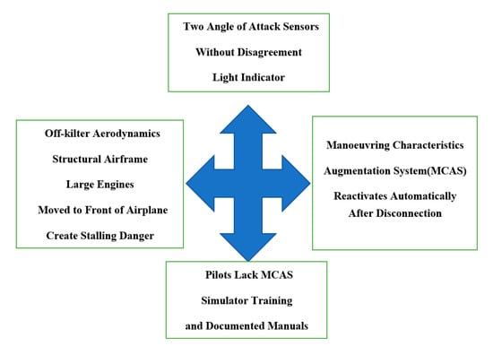 The normal accidents theory pertains to the social side of technological risk []. It postulates that the conventional engineering approach to ensuring safety by building in more warnings and safeguards fails, because the complexity of systems makes failures inevitable. Perrow [] asserts that systems that are both interactively complex and tightly coupled incline to catastrophic failure. In such cases, errors in subsystems are susceptible to occur. Furthermore, these errors will spread and interact in ways that are difficult to foresee, understand, or mitigate. Furthermore, in certain cases, precautious measures meant to enhance safety end up adding complexity, which fails their purpose by leading to accidents. In the case of airplanes, there are two main systems whose safety is of critical priority: engines and flight control. Errors in systems happen frequently, they are expected as part of normal operations, and the system is supposed to continue functioning properly despite their occurrence. It is the interdependency between systems that creates hazard. As will be discussed, Boeing created such an interdependency between the propulsion and maneuvering systems by shifting the engine’s location forward and installing a complex MCAS system to balance the airplane flight control []. According to Perrow’s theory [], this tightly coupled link is prone to catastrophic failure, because it will interact in dissonant ways that are difficult to foresee, understand, or prevent. Indeed, the MCAS system exemplifies Perrow’s theory [], since it pushed the airplane nose down due to a false sensors’ reading instead of ensuring safety by preventing it from stalling []. Pilots had insufficient response time, and the complexity of MCAS prevented their interference to amend risk by disactivating the system. High reliability organizations (HRO) are designed to cope with unexpected situations []. According to Weick [], organizational culture is a source of high reliability. Weick illustrates HRO effectiveness in the case of air traffic control, nuclear power generation, and naval carrier operations.