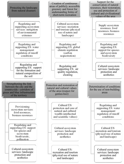 The actual framework of ecosystem services (ES) has not yet been systematically integrated directly into spatial planning [1]. Although ecosystem services are a powerful spatial and environmental planning tool that can help decision-makers to better understand the changes between different development scenarios for natural ecosystems [2], they can also bring a new facilitating approach in a comprehensive and long-term solution to the sustainable development of urban areas [3,4,5,6]. The direct integration of the concept of ecosystem services and their categories into spatial planning documents could facilitate the way for the inclusion of information on both the environment and public values in the implementation of the process of sustainable territorial development [7].