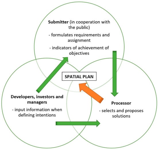 The main tool in the creation of spatial plans, which will ensure the effective implementation of ecosystem services into spatial planning, is the assignment of a spatial plan. The existing legislative rules (Annex No. 6 to Decree No. 500/2006 Coll.) defining the structure of the Assignment allow this with their generality. However, this step cannot be approached in an uncoordinated manner; it is necessary to compare the detail of the ES’s inclusion in the Assignment with other measures, such as the detail of the explanation of the technical infrastructure. Ways in which individual groups of main participants in the creation of the Spatial Plan Assignment can use ESA in the process of preparing the spatial plan are presented in Figure 4.