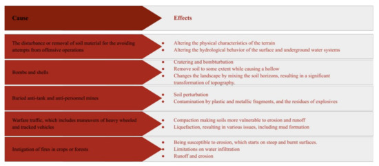Finally, instigation of fires in crops or forests has numerous adverse consequences on the physical properties of soil [11,52,53,54]. The most indirect significant impact is susceptibility to erosion, which rapidly propagates on steep, incinerated surfaces. Furthermore, due to the fire-induced formation of a hydrophobic layer at shallow depths that prevents/limits water infiltration, these areas are highly vulnerable to runoff and erosion [11,55,56], which may result in shallow landslides and debris flow [57]. A cause-and-effect diagram regarding the physical impacts of military activities on the soil is presented in Figure 1.