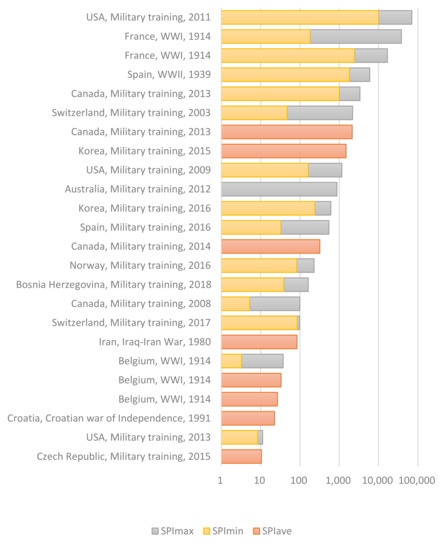 where C0 is the measured background concentration of the selected PTE as a warfare tracer [71] and Ci is its soil concentration. In other words, the geometric mean of the individual indices for PTEs reported in each case provides the SPI value for the study reviewed. Only the results for PTEs being common warfare metal tracers (e.g., Cu, Pb, Zn, and Sb) have been included in the assessment, and SPI is limited to the extent of their availability of reporting in individual studies. The SPI levels calculated for the reviewed studies are presented in Figure 2. The sites were then classified using the following scale: (1) extremely contaminated (SPI > 10,000), (2) very highly contaminated (1000 < SPI < 10,000), (3) highly contaminated (100 < SPI < 1000), (4) moderately contaminated (10 < SPI < 100), and (5) marginally contaminated (SPI < 10).