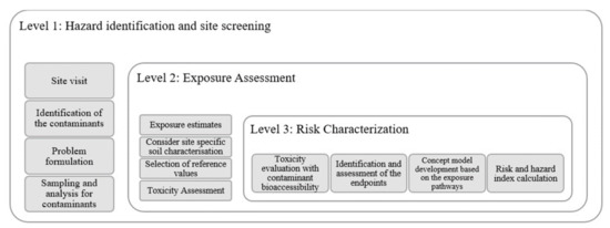 Levels of risk assessment method for military-impacted sites (adapted from Jung et al. [101], Ryu et al. [6], and U.S.EPA framework for risk assessment of Superfund sites [162]).