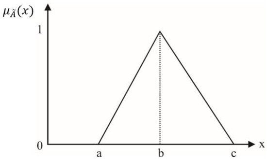 - Attribution function: Fuzzy set refers to a set of things with unclear boundaries and specific properties. The concept of the fuzzy set is that whether an element, , belongs to a set, , is no longer a question of “if it is or not “, but rather an attribute value of 0 to 1 is used to indicate the degree of belonging to . Expressed as a function as Formula (1):is called the attribute function of in fuzzy set . It can be understood from the formula of (1) that any function value can become a membership function as long as it is between 0 and 1 and conforms to common sense. If is closer to 1, it means a higher degree of belonging to . Suppose U is a universe of discourse, and is a fuzzy subset of U. If a number, , is assigned to each , it is used to represent the degree of belonging of to , referred to as the degree of belonging of ; that is , and is called the attribution function of [79].When the attribution function is determined, the fuzzy set is also determined. How to choose an appropriate attribution function is often the key to determining whether the attribution function can be successfully applied. The most commonly used attribute function is the triangular fuzzy attribution function. The triangular fuzzy attribution function graph is shown in Figure 2, and the three value points (a,b,c) are denoted as fuzzy events. The attribution function can be defined as Formula (2) [72,80]: