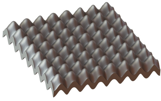 The double corrugation of the plates presented in this article is inspired by nature [41,42]. It was found that tuna, opah and lamnidae sharks can maintain their regional or whole-body temperature at some degrees above the surrounding water temperature. This is because all of these fishes have cross-flow heat exchangers that allow the cold blood arriving to the specific part of the body to be pre-warmed by the blood leaving that part of the body. Two sets of equations were derived to mimic the surface of the blood vessels found in opah [41,42] in a shape of double corrugated tubes with the constant cross-sectional area, Ac, reported in [43,44] and the constant hydraulic diameter, Dh, reported in [43,45]. The surface of the plates analysed in this study is mathematically described by Equation (1), which is derived from a set of equations describing tubular geometry in [43,45]. In this study, Equation (1) mimics the involute of the double corrugated tubes, disregarding the concept of constant hydraulic diameter or constant cross-sectional area, which were investigated in the case of a tube shape. A desired double corrugated plate is created by extruding the surfaces obtained with Equation (1) by the thickness z. Figure 1 shows the volumetric volume of a double corrugated plate AR1.6P02 with plate thickness z = 0.1 mm.