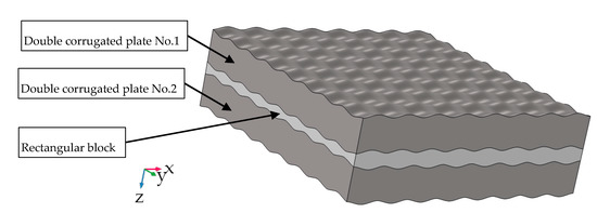 The numerical analysis was performed on the fluid flow in the passage between two plates, which was obtained by subtracting the surface of the geometry of interest from a rectangular block, as shown in Figure 2. Note that the double corrugated plate No. 2 in Figure 2 is offset by a half of the corrugation period, so the peaks of the plates would touch. However, in this study a small distance (which is maximum 20 μm) between the two double corrugated plates was left in order to obtain the numerically stable and physically correct solution.