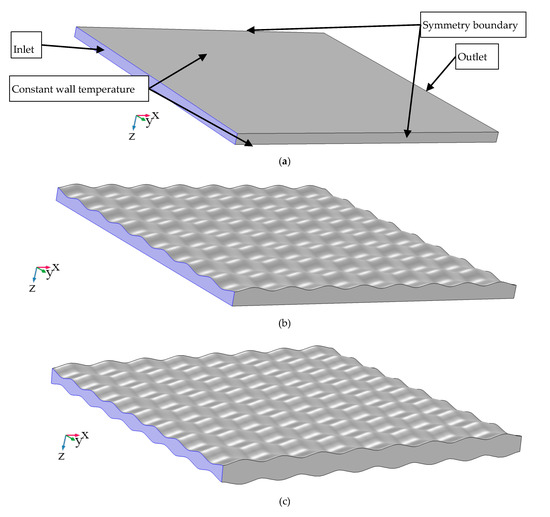 As shown in Figure 3, a small differential volume of the fluid flowing in the passage between the parallel plates was modelled in order to reduce the required computational power. Laminar fully hydrodynamically developed non-isothermal fluid flows, assuming constant wall temperature conditions imitating the top and bottom plates as shown in Figure 3a, were used. The name of the geometries constructed using double corrugated plates reflect their geometrical characteristics, e.g., AR1.1 means that the aspect ratio AR = 1.1, P02 means that the corrugation period P = 0.2 mm and the presence of the letter “M” means that the geometry consists of two double corrugated plates with the same geometrical characteristics. Note that all models were constructed in the same manner, and the explanation is given only for Figure 3a in order to maintain the readability of the figure.