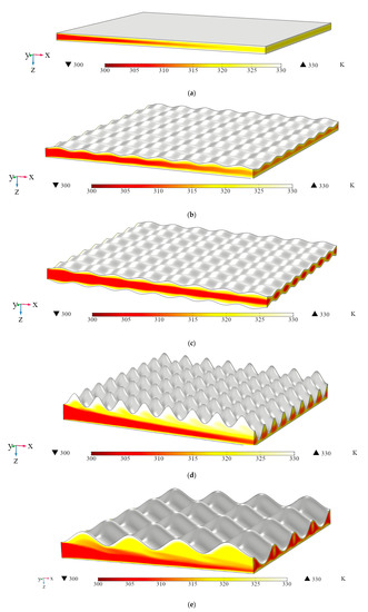Figure 4 demonstrates how the double corrugated geometry disturbs the development of thermal boundary layers and enhances the heat transfer over the whole modelled domain compared to the flat plate geometry. Note that the three-dimensional temperature field presented in Figure 4 is evaluated at the same pressure drop for all the geometries, which is Δp = 3397 Pa, and is the maximum available for the flat geometry where the development of the thermal boundary layers takes place rather fast. The geometrical features and slightly different cross-sectional area, Ac, which is provided in Table 2, lead to a different mass flow rate, m ˙ , at the inlet of each analysed geometry. One can also see that with the increasing corrugation intensity fluid flow is disturbed more effectively. However, as it is seen from Figure 4d,e, a fast-flowing fluid tends to bypass the very intense corrugation, i.e., corrugation with high amplitude and small period, along the flow direction, resulting in an effectively narrowed size of the flow channel. This observation was also reported in [43]. More clearly, the effect of the geometrical features on the fluid flow velocity is presented in Figure 5.