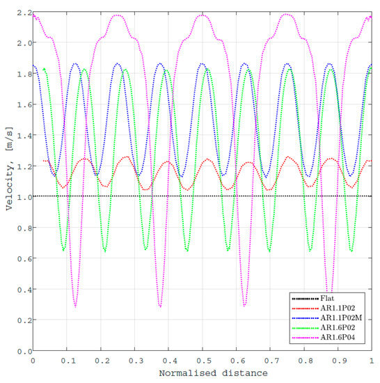 From Figure 5, it is clearly seen that the double corrugated geometry is causing strong fluctuations in the fluid flow velocity, and effectively in the mass flow rate across the geometry. It is also clear that the strongest fluctuations in fluid flow velocity are observed for AR1.6P04. This observation agrees with the findings from Figure 4d,e.