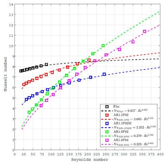 Figure 6 demonstrates the performance of the analysed geometries in terms of Nusselt number. The Nusselt number fit presented in Figure 6 was obtained using the least square curve fit tool in MATLAB®. It must be emphasised that the models of the flat plate geometry did not reach the required convergence accuracy under the fluid flow conditions with the three highest Δp, therefore the data obtained with these models were omitted from the further analysis.