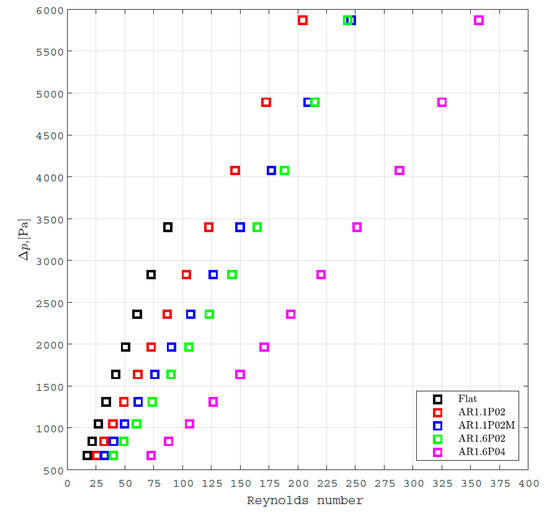 It is also noticeable that the Reynolds number strongly depends on the modelled geometry, since it drastically affects the fluid flow velocity, as shown in Figure 5. Figure 7 presents the relation between the pressure drop and the Reynolds number for all the modelled geometries.