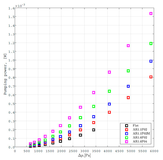 Figure 8 shows the pumping power, W, as a function of Δp. One can see that the pumping power exponentially increases with the increase in pressure drop.