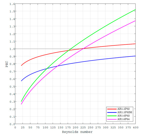 As expected, the higher the aspect ratio of the corrugation is, the higher is the pumping power required at the same pressure drop conditions. However, it is interesting to observe that the double corrugated plates with AR = 1.6 with P = 0.2 mm demonstrate from 20% to 40% lower required pumping power than the same geometry with P = 0.4 mm even though the cross-section area at the inlet for both geometries is effectively the same. Figure 9 shows the PEC as the function of Reynolds number.