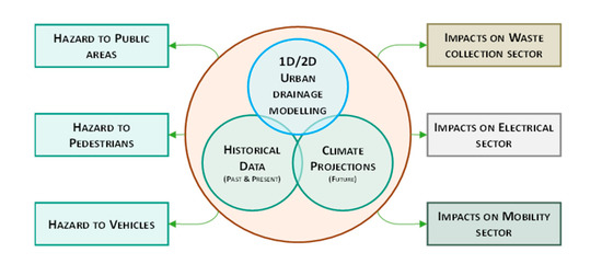 Investigation on detailed cascading effects and quantification of impacts from climate driven hazards may be reported, namely regarding infrastructure or service constraints and failure. In a city where such models are not available, detailed GIS analysis of hazard maps provides valuable information [36,37].