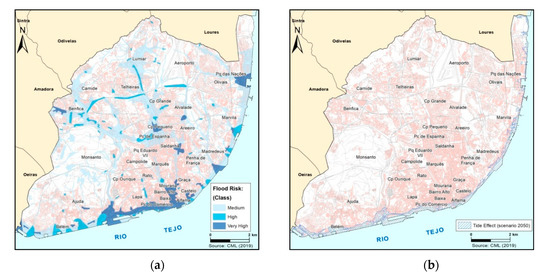 Lisbon flooding hazard maps. Current situation for flooding induced by rainfall or estuary tides (a) and considering climate change for 2050 (b) for flooding induced by estuary tides [33].