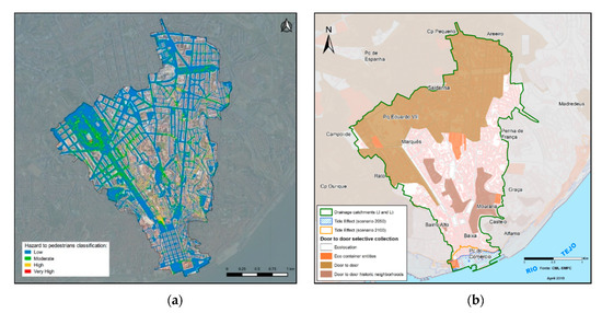 Lisbon drainage catchments J&L flooding-related hazard maps. Hazard to pedestrians for flooding induced by rainfall for 2100 (a) and impact on waste sector for flooding induced by sea level rise by 2050 and 2100 (b) [33].