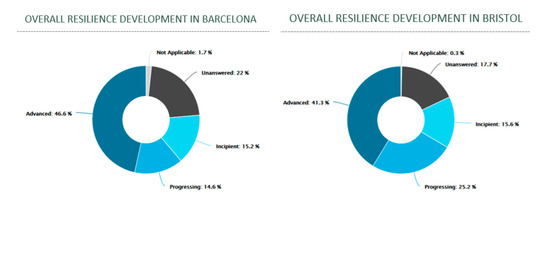 The Resilience Assessment Framework (RAF) (2.3) was applied by the three cities in this Step 4 [17,24] in order to carry out a structured assessment and support diagnosis and definition of the strategies. Figure 5 presents the overall resilience development level of each city, Barcelona, Bristol, and Lisbon displaying the percentage of all metrics assessed in each development level.