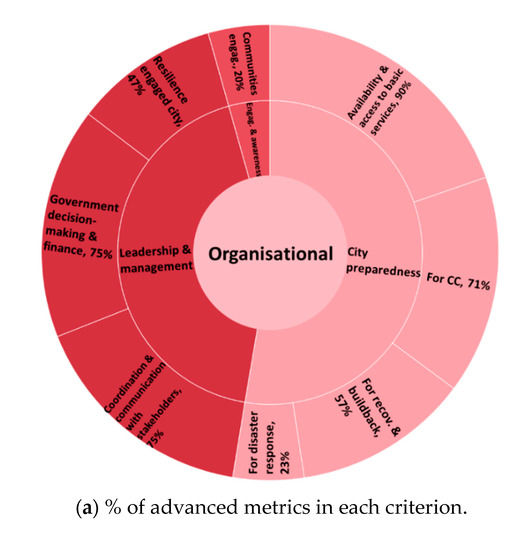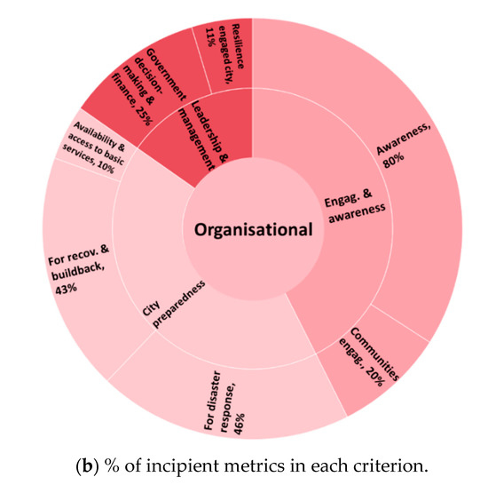In Figure 7, to illustrate the results related to the RAF purpose, an overall assessment for the organizational dimension is presented. Figure 7a presents the main strengths for the organizational dimension (inner circle), identifying the resilience objectives (middle circle) and criteria (outer circle) where are presented the percentage of metrics with an advanced level of development. Lisbon is well developed regarding leadership and management (O.2) and city preparedness (O.3), in this from the points of view of availability and access to basic services, preparedness for climate change and recovery and build back, while also presenting some relevant developments on collective engagement and awareness (O.1). Figure 7b presents the main weaknesses of the organizational dimension, identifying the resilience objectives and criteria with metrics in the incipient level of development. The main opportunities for development are those related to collective engagement and awareness (O.1) as well as city preparedness (O.3) from the points of view of recovery and build back, where there is still a great room for improvement, and disaster response.