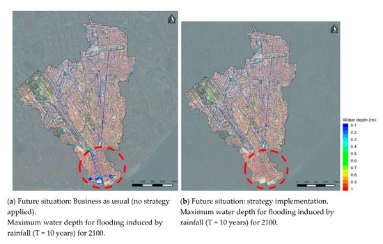 In Lisbon, the impact of the strategy “Promoting urban rehabilitation as a tool to increase resilience: sewer systems” is presented in Figure 8, before (a) and after (b) the strategy implementation, for flooding induced by rainfall for 2100. It is evident the improvement regarding the water depth in the downtown area, within the red circle. It will contribute to improve the organizational resilience, namely regarding the leadership and management and the city preparedness objectives. This strategy will also contribute to improve both spatial resilience objectives and is related to all services of functional and physical dimensions.