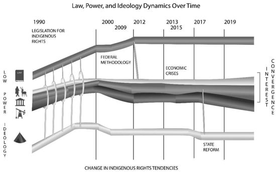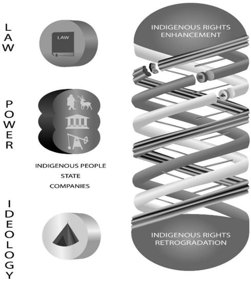 We analyzed the shift in benefit-sharing arrangements as resulting from a convergence of actors’ interests—an alignment which created space for a greater expression of Nenets herders’ rights. We define rights as intertwined legal processes, ideologies, and power relations, all three of which co-produce each other [,]. We conceptualized this intertwining as a “triple-helix” [], a model inspired by molecular structures []. All three strands (law, ideologies, and power relations) co-evolve in an interdependent way, twisting forward (toward greater rights) or backward (toward diminished rights, i.e., “retrogradation”) [] (see Figure 1). As this case suggests, however, dynamic changes in each strand may not be evenly distributed. Instead, shared interests may lead to greater Indigenous empowerment without a greater acceptance of ideologies of indigeneity. This section outlines ways that legal frameworks, ideologies, and power relations co-evolve, or are subjected to retrogradation. It then introduces the potential of interest-convergence in turning the triple helix.