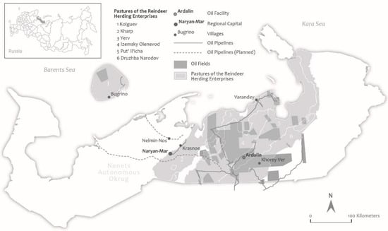 The Nenets Autonomous Okrug is situated in the northwest of Russia (see Figure 2). Most of its territory is above the Arctic Circle. The population is composed of ethnic Russians, Nenets, and Komi. Some Nenets and Komi IPs engage in the traditional livelihood practice of reindeer herding, which, for some, is still their main source of income [] (p. 51) []. In the Soviet period, the regime encouraged Nenets settlement and the creation of collective farms for reindeer and fur and fishing enterprises []. Local communities depended on state-owned enterprises and collective farms for social services and community infrastructure. In remote areas, enterprises provided electricity, water, and sewage services, as well as educational and medical facilities, and cultural programs. These Soviet-era practices created persistent expectations about the roles of companies in providing welfare into the post-Soviet period [].