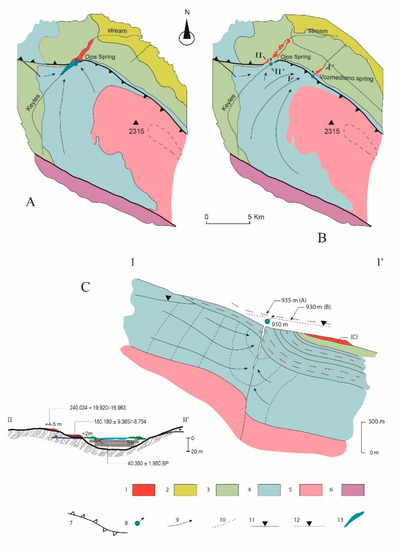 - To determine ancient changes in the flow of groundwater due to earthquakes, a study was made on the calcareous tuffs of the springs. This cartographic study made it possible to locate the tufa outcrops associated with the Vozmediano and Ojos del Queiles springs. There is a distance of six kilometers between the two springs; in this space there are no other tuff deposits that indicate the existence of a paleo-spring. Five tuff samples from these springs were collected for dating via a U/Th imbalance series carried out at the Institute of Earth Sciences “Jaime Almera” of the CSIC using ICP-MS [19]. Preparation of the samples and radiometric dating using 14C was carried out by the Instituto Rocasolano of the CSIC (Consejo Superior de Investigaciones Científicas).