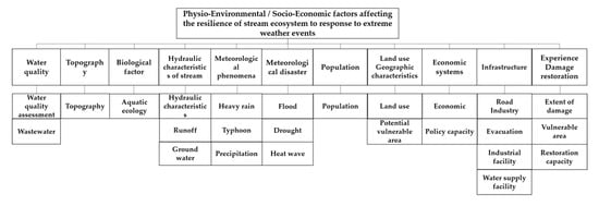 Based on the social–ecological systems concerning green infrastructure, the indicators for a resilient stream ecosystem were also divided into socio-economic and physio-environmental categories, and the criteria for the classification of these categories were set as shown by Table 3.