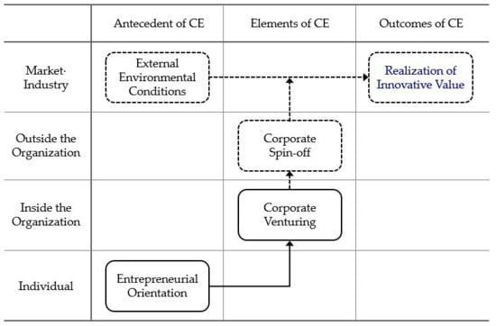 In this study, the entrepreneurship of spin-off company is expected to be promoted and manifested through the process of Figure 1. In Figure 1, the horizontal axis represents the antecedents, elements, and outcomes (left to right), which are the components of CE activity, and the vertical axis represents the level of expansion (bottom to top) of CE area from individuals to markets and industries. If the previous studies have confirmed that CE evolves from individual-level entrepreneurial orientation to organizational-level entrepreneurial activity, this study will attempt to explore how organizational-level entrepreneurial activities develop into market- and industry-level innovative values. In other words, it was confirmed through the existing studies that CE begins with an individual’s entrepreneurial orientation, and that it can be expressed as a specific entrepreneurial activity at the organizational level via the corporate venturing system. Furthermore, this study includes the corporate spin-off system as a way to expand the performance of the corporate ventures to the social-level and tries to confirm its validity through case studies. In Figure 1, what was confirmed through the previous studies is indicated by a solid line, and those that need to be further confirmed through this study are indicated by a dotted line. Corporate spin-off will enable companies to generate financial and non-financial performance and create unprecedented innovative value. In addition, if external environmental factors such as demand in products and markets, advance of related technologies, national support policies, and strategic cooperation between companies are added, CE will finally be able to develop into a form of realizing innovative values.