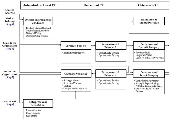 In addition, Ireland et al. [] have proposed CE strategy as a means to revitalize the organization deliberately and continuously. The primary components of the CE strategy are divided and conceptualized here as “antecedents, elements, and outcomes,” and the model for the overall CE strategy is presented by linking their relationships. The study also emphasizes the entrepreneurial organizational structures and entrepreneurial behavior of seeking opportunities as the key elements and success factors of CE strategy.