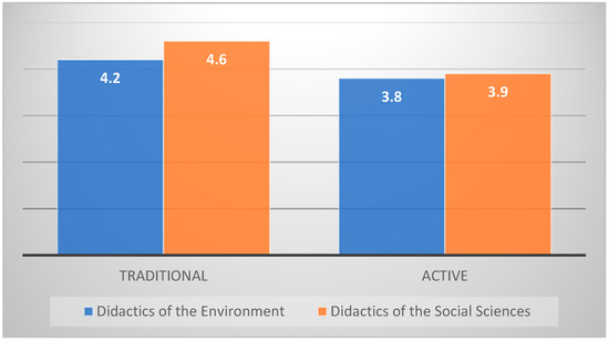 As Figure 1 shows, in both subjects, around 4.2 and 4.6 out of 5 of the quantitative evaluations recognized that the traditional and lecture-based methodology plays a leading role in most of their university education. At the same time, between 3.8 and 3.9 of the assessments confirmed that an active and participatory methodology favors meaningful learning. Therefore, it should be noted that the teaching methods implemented today continue to give priority to the teacher’s presentation, dictating notes, and the theoretical exam. Even so, they agreed to carry out research and use digital resources to interpret heritage and natural assets.