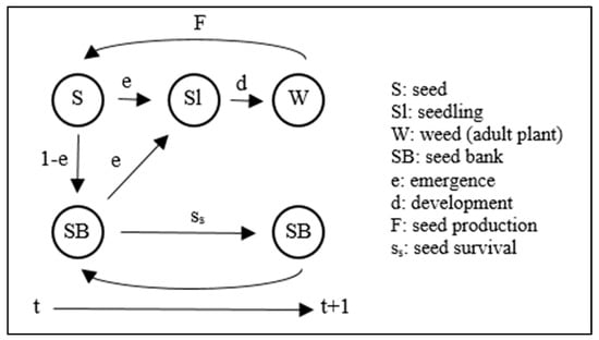 The schematic diagram includes the three plant phenological stages of teosinte (S: seeds; Sl: seedlings; and W: adult plants) and the corresponding biological growth processes (e: emergence; d: development; and F: seed production). In addition, the life cycle contains the evolution of the soil seed bank, which is dominated by emergence (e) and seed survival parameters (ss). This dynamic is affected by the available control strategies which affect the development process (d) and the seed survival capacity (ss) in different ways [27].