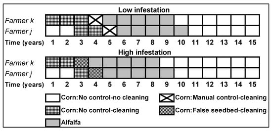 In the case of high infestation (bottom cells in Figure 2), the model establishes that farmer k would select the “no control–cleaning” strategy for 2 years, “false seedbed technique–cleaning” in the third year and alfalfa for 5 years. Afterwards, corn monocropping would be restored in year nine, because rotations are not mandatory in this context. Consequently, farmer j would detect the presence of teosinte plants in year three and would select “no control–cleaning”, “false seedbed–cleaning” and rotations in year five.