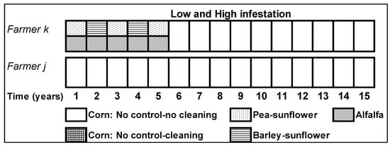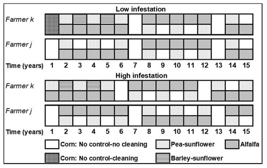 Figure 4, however, illustrates the optimal control strategies if crop rotations are always mandatory. In this case, plot k with low infestation selects the “no control–cleaning” strategy in year one and adopts rotations from years two to six with half the area devoted to alfalfa and the other half alternating with pea–sunflower and barley–sunflower. In year seven, the corn crop can be planted again because teosinte and its seed bank have been eradicated. From year eight, the area allocated to alfalfa is planted with pea–sunflower and corn in alternating years.