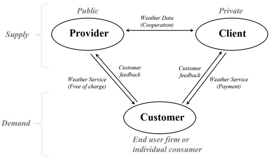 Providers, such as governments and international organizations, invest significantly in the infrastructure and research necessary to provide weather services and in return, obtain data and services from a range of noncommercial bodies with in-house value-adding expertise. Many of these services are freely shared with other public and private sector organizations and provide direct benefits to customers for free [20]. The client part can be regarded as the role of private weather companies. It is not financially viable for a private sector company to produce and collect such massive amounts of weather information, as the return on investment would be insufficient. Thus, these functions have traditionally been executed by government agencies on a large scale. Instead, through customer contracts, private weather companies can provide customized weather services, which the government cannot.