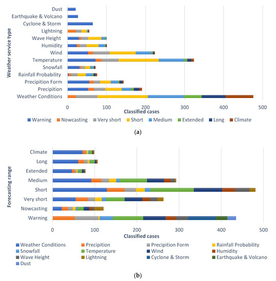 Analysis of public weather service status by (a) weather service type and (b) forecasting ranges.