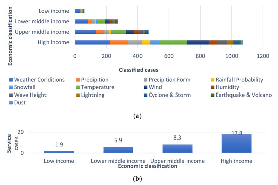 Public weather service status by national economic classification: (a) by total number of service cases and (b) by average number of service cases per country.