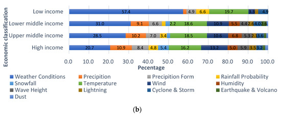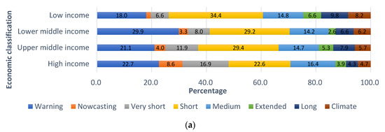 According to the data, as of 2019, there were 61 high-income, 56 upper-middle-income, 46 lower-middle-income, and 31 low-income countries worldwide. The number of service cases in high-income countries was 1072, in upper-middle-income, 470; in lower-middle-income, 274; and in low-income countries, 61 (Figure 3a). The average number of national services per economic group has been increasing in high-income countries and was at 17.8 in 2016, about 9.3 times higher than that in low-income countries (i.e., 1.9; Figure 3b). In addition, as income increased to higher national units, the proportion of nowcasting and very short categories of forecasting services increased by about 68% (Figure 4a). This is a result of national investment in areas that require capital and technology for driving a country’s own numerical weather forecasting models. By contrast, the diversity of weather services in low-income countries decreased, while the proportion of simple services at the level of weather delivery increased. Weather condition services in low-income countries accounted for 57.4% of all offered services (Figure 4b).