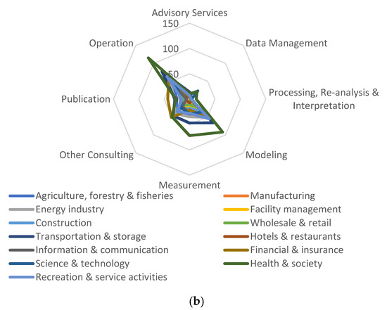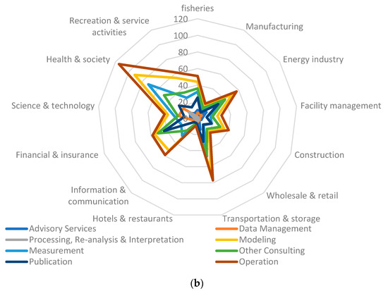 There were 13 categories in the classification of services by related industries to facilitate social environment classification and correlation (as analyzed later in Chapter 3), namely, agriculture, forestry, and fisheries; manufacturing; energy; facility management; construction; wholesale and retail; transportation and storage; hotels and restaurants; information and communication; financial and insurance; science and technology; health and society; and recreation and service activities. Following certain classification criteria, the total number of private weather services supplied was 2400. The analysis of the status of private weather services provided by related industries showed that health and society services, which provided raw data of 400 cases (16.7%), had the highest volume of services. This was followed by transportation and storage (11.9 %), financial and insurance (10.0%), energy (9.7%), recreation and service activities (8.7%), science and technology (7.5%), information and communication (7.3%), construction (6.2%), facility management (4.5%), wholesale and retail (3.8%), manufacturing (3.4%), and hotels and restaurants (1.8%; Figure 5a). In most industrial categories, the concentration of the health and society service sector was strong (Figure 5b).