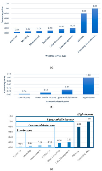 Both the supply and transaction volumes of these quantitatively investigated weather services show differences in patterns among them. For example, the operation service had the highest supply volume but the lowest transaction volume. High supply means that the unit cost tends to be low because of many competitors. A high supply and low unit cost but low transaction volume mainly indicates that demand has risen from services with low willingness to pay (WTP). By contrast, low supply means that there is high tendency toward a high unit cost due to fewer competitors. Low supply with high unit cost but high transaction volume results from rising demand for services with high WTP. By contrast, low supply means that high unit cost is quite likely due to fewer competitors. Low supply with high unit cost but high transaction volume mainly indicates that demand has risen for services with high WTP. The trend was analyzed by calculating the ratio of supply to transaction volume for each weather service type and converting the maximum value to 1 (Figure 8a). The average of expenditures for meteorological services per capita (in dollars) for countries classified by development status based on the World Bank Income Group were 0.89 (for low-income countries), 2.35 (low-middle), 5.65 (high-middle), and 19.83 (high-income). Figure 8b shows the trend by converting the maximum value to 1 so that a comparison can be made with Figure 8a. Based on this figure, operation services is likely to be in demand for the low-income countries. The WTP trend value for the lower-middle-income countries is 0.12, which is a likely range of demand for operation to publication services. Similarly, for upper-middle-income countries, data management service is likely to be in demand, and for high-income countries, all services are within the range of demand (Figure 8c). Based on these results, the taxonomy table is presented for diagnosing the types of weather services likely to be in demand in accordance with the national social environment (i.e., national income and industrial characteristics; Table 6). The taxonomy lists the industry (I) classifications on the vertical axis and the economy (E) classifications on the horizontal axis. An IE code was assigned to each cell and configured to allow estimation of the range of weather service types that are likely to be suitable for each code. This table can serve to diagnose which type of service the supplier should be more interested in, mainly considering the industry characteristics and economic conditions of the supplier’s target demand.