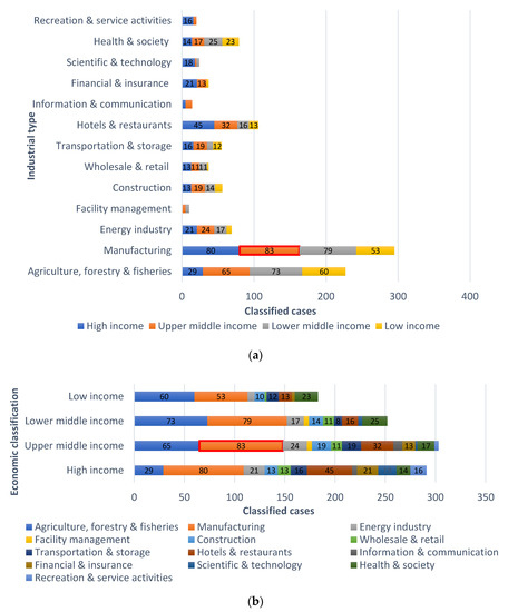 In the national social environmental analysis, the number of cases, at 1029, was derived according to the classification criteria. According to the industry analysis, manufacturing ranked highest for the largest number of industries, with 295 cases (28.7%), followed by agriculture, forestry, and fisheries (22.1%), hotels and restaurants (10.3%), health and society (7.7%), energy (6.7%), construction (5.4%), transportation and storage (5.3%), and availability management (1.0%). According to the analysis by economic level, 303 cases (29.4%) were included in the category of upper-middle-income countries, which was the largest group, followed by high-income (28.3%), lower-middle-income (24.5%), and low-income (17.8%) countries. For the recreation and service activities and science and technology categories, high-income countries accounted for more than three quarters. Thus, these industries are likely to have sufficient demand in high-income countries. The lower the income level, the greater is the proportion of agriculture, forestry, and fisheries, and health sectors in major projects. This implies that these industries are likely to have sufficient demand in low-income countries. However, the proportion of the hotels and restaurants and recreation and service industries tended to decrease, which is likely because countries with lower income levels have more difficulty in activating weather services.