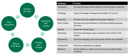 The worked example site can be duplicated by enrolling the preservice teachers as the editors of the site. The preservice teachers can build on the structure to choose new design challenges and perform the necessary content and task analyses. The TPD processes along with the pedagogical structure of the STEMQuest are illustrated in Figure 1. The pedagogical function of each page was explained to the preservice teachers to understand the what and why of the design. In essence, the STEMQuest was anchored with an engineering design challenge. The collaborative works were directed by rules and role specification. The self-directed component was guided by the evaluation rubrics and post-design reflection. One to two webpages were created specifically for each of the STEM subjects, providing instructional resources (e.g., instructional videos), scaffoldings (spreadsheets or infographics), and directions for the use of possible applications as inquiry or cognitive tools (e.g., Audacity, to review sound wave patterns). For example, the webpages of mathematics usually require students to articulate the quantitative variables that need to be measured. Spreadsheet files or other ICT applications can be embedded for students to access. The formulas connecting the variables can be inserted in the relevant cells in the spreadsheet or scripted on other ICT applications. This allows the students to view the outputs as the data are being inputted. Alternatively, the teachers can request the students to write or script the formulas.