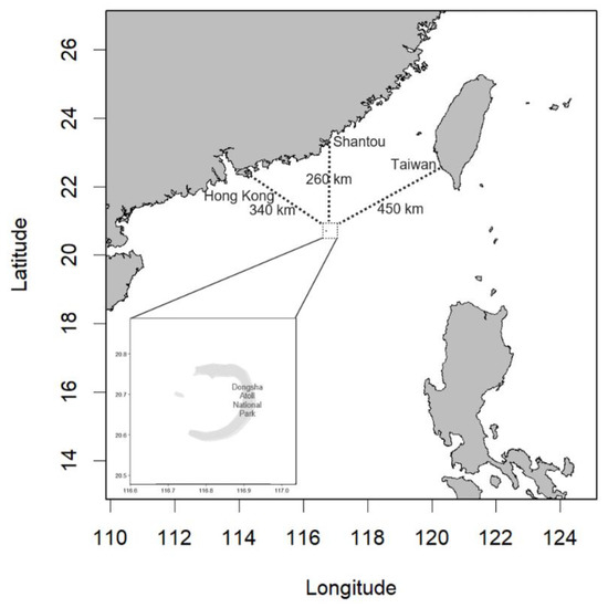 Dongsha Atoll (DA) is located at 20°40′43″ N and 116°42′54″ E, and is the largest and the first developed, northernmost atoll in the South China Sea (SCS). It has formed a perfect ring-shaped reef with well-developed coral reefs, supporting highly diverse fauna and flora. It is about 340 km southeast of Hong Kong, 260 km south of Shantou off the Chinese mainland, and 450 km southwest of Taiwan (Figure 1). The atoll is approximately 25 km wide in diameter, and its reef table that emerges above water during low tides is approximately 46 km in length and 2 km in width. The inner-reef and lagoon covers more than 600 km2, and the maximum depth is approximately 23.7 m [19,20].